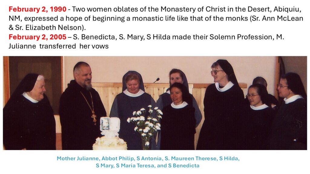 MISSION STATEMENT –The Monastery of Our Lady of the Desert is a monastic community of women in the Benedictine tradition. We profess vows of stability, conversion of life and obedience. Our primary mission, is to seek God through a life of prayer, silence and solitude. Our way of life frees us to give glory and praise to God, intercede through prayer for the needs of the world and hospitality