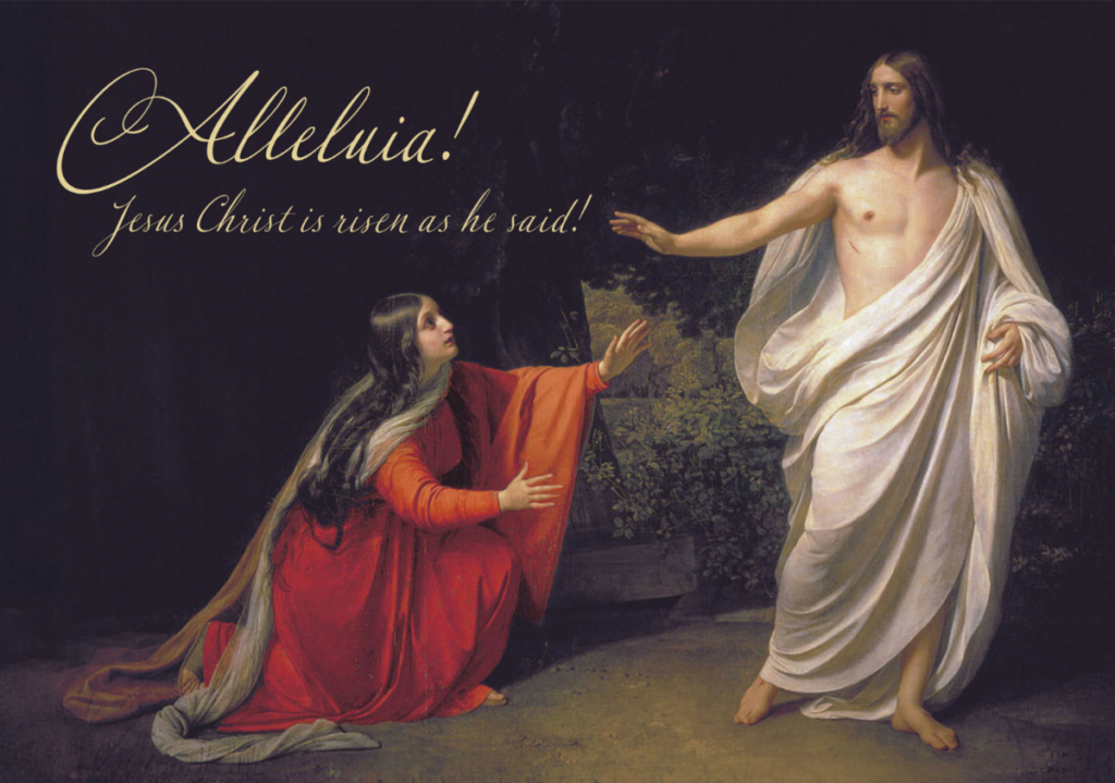 The above painting, “La Résurrection,” by Andrea Montegna 1431-1506, (Wikimedia) depicts the power and glory of Jesus Christ rising from the tomb. Notice the faces of the onlookers in a mixture of emotions: awe, calm, fear and great joy as the believers encounter the power of Christ’s victory over death. Let us pray with St. Gregory the Great, “You cleared away the darkness of sin by your magnifient and radiant Resurretion. You broke the bonds of death and rose from the grave as a conqueror. You recociled heaven and earth. Our life had no hope of eternal happiness before you redeemed us. Your Resurrection has washed away our sins, restored our innocence, and brought us joy. How inestimable is the tenderness of your love. Amen.”